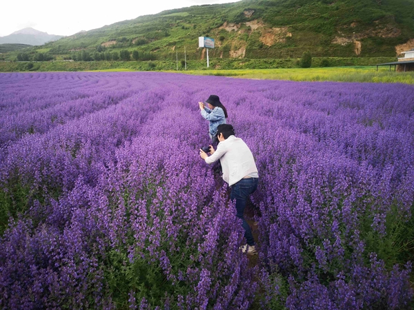 从九寨沟县自驾到圣地花海赏花的李女士,轻盈地穿梭在花间的栈道上,一会儿闻闻花香,一会举起手机自拍。“这片薰衣草真是漂亮,每株薰衣草感觉高矮胖瘦都是一样的,长得真均匀!”李女士欢快地赞叹着这幅绚绮的紫色画卷。