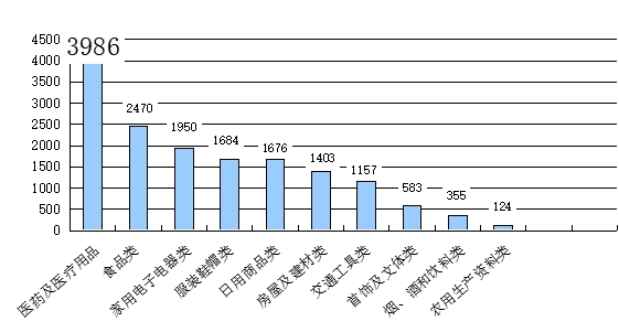 按商品种类来分,涉及医药及医疗用品、食品、家用电子电器类的消费者投诉居前三位。