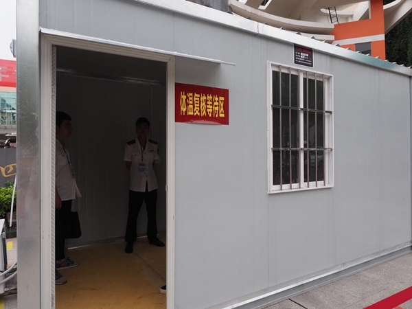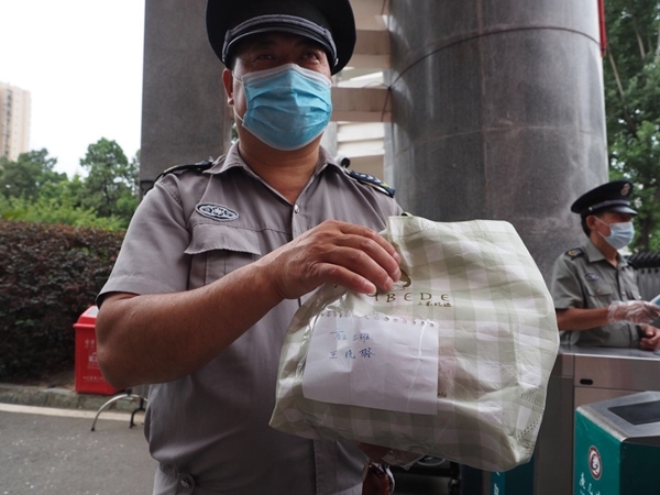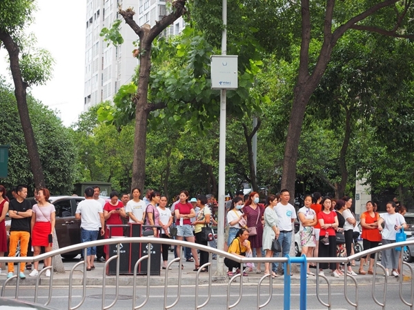 记者在现场看到,家长将孩子送进考场后,就在马路对面等候。8点15分左右,一位家长将考生的衣服通过工作人员接力递进考场。