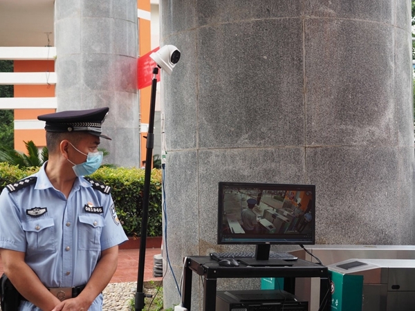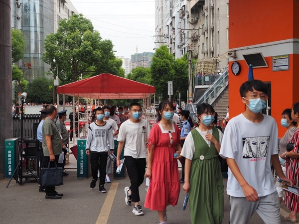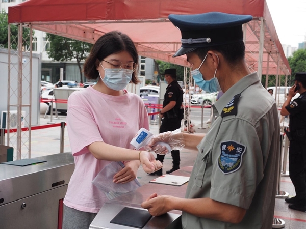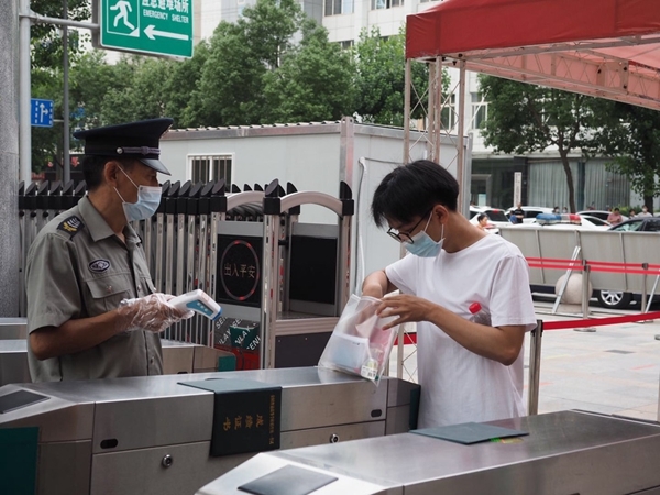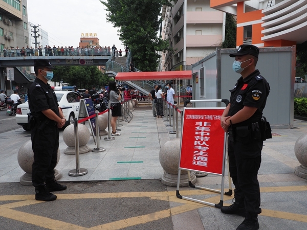 为了准确测温,考点门口除了安排工作人员测体温外,还设立了红外线测温仪。为避免人群聚集,考场拉起了警戒线,往年高考站满人的人行天桥也被疏散开来。