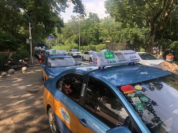 7月7日11时30分,泸州高级中学校(简称泸州高中)考场外,近20辆爱心出租车正在交警指挥下排队等候学子,将家住的较远或是公交线路无法直达的学子们免费送到家。