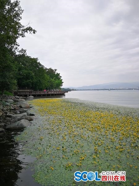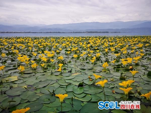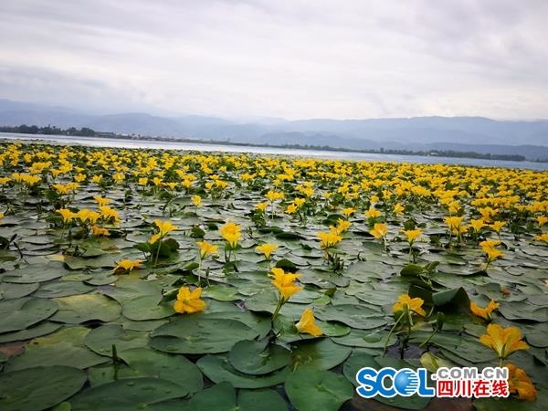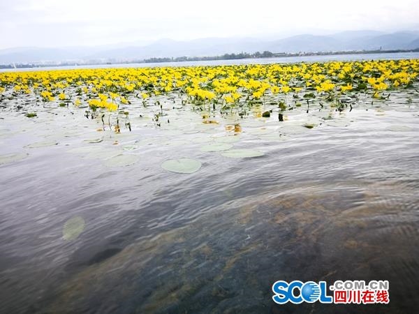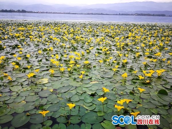荇菜是浅水性植物,漂浮于水面或生于泥土中,叶片小巧别致。在西昌邛海,近期以来,朵朵荇菜花盛开,鲜黄色花朵挺出水面,随风而动,仿佛如一张金色的地毯铺在邛海水面。