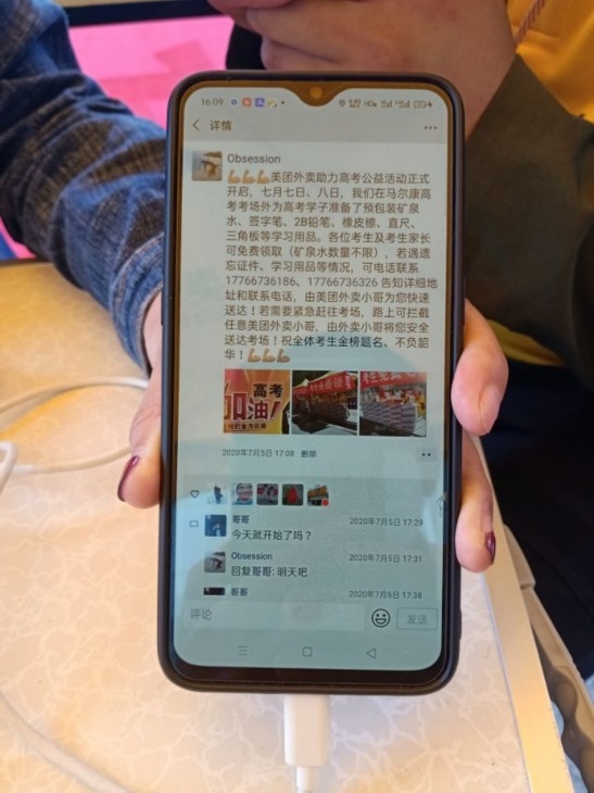 杨艳把服务考生这件事称为美团外卖助力高考公益活动。她向记者展示了其手机微信上的活动介绍。杨艳称,考生若遇证件遗忘、学习用品遗忘等紧急情况,可以拨打已公布的电话,在告知详细地址和联系电话前提下,外卖小哥迅速免费送达。