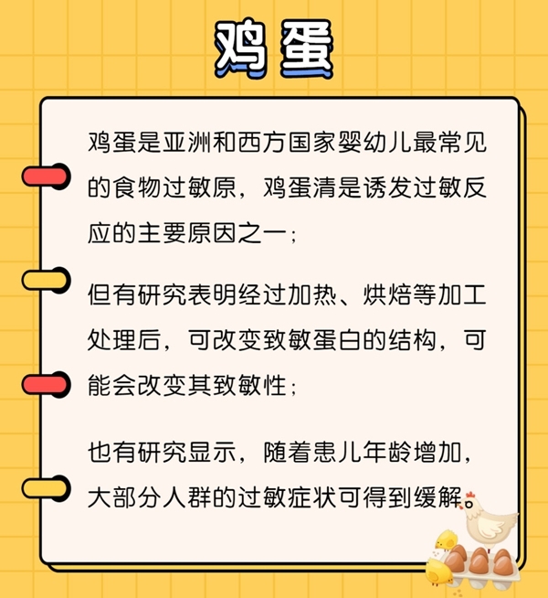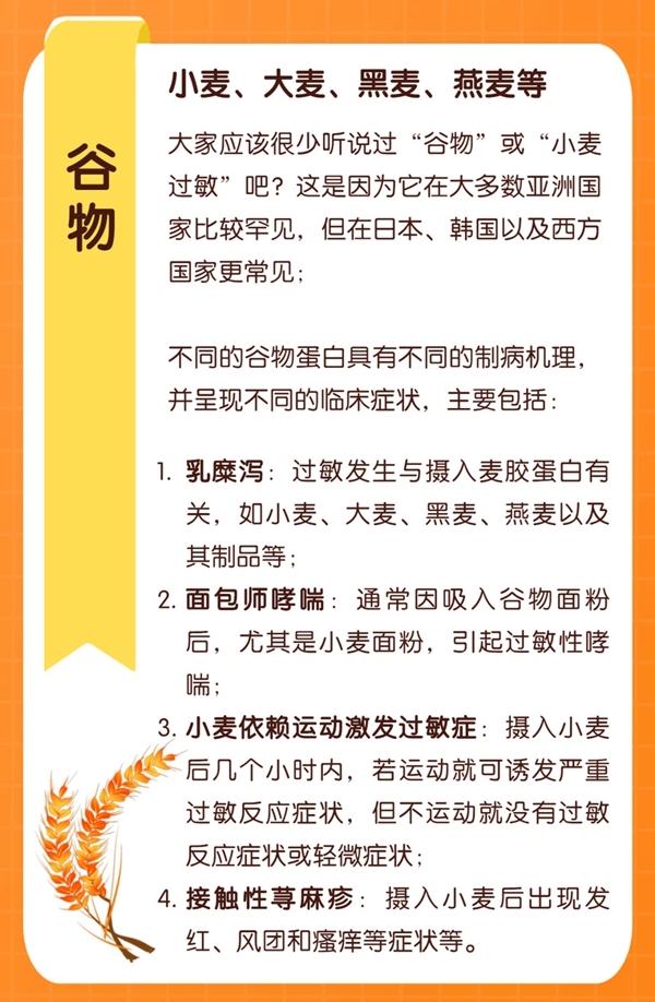 据四川大学华西医院营养科刘晓阳医生介绍,食物过敏原通常是蛋白质类、或是能与蛋白质上的化学物质结合。联合国粮食与农业组织(Food and Agriculture Organization,FAO)公布的常见的致敏食物包括:鸡蛋、牛奶、小麦、大豆、甲壳类、鱼类、花生、坚果等。