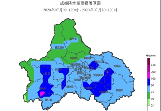 7月9日下午,成都市气象台发布暴雨蓝色预警: 预计成都市9日20时到10日20时有一次明显的雷阵雨天气过程,雨量中雨到大雨,其中西南部和东部局部地方可达暴雨,个别点可达100毫米以上,雷雨时伴有短时阵性大风,最大小时雨强40-60毫米。