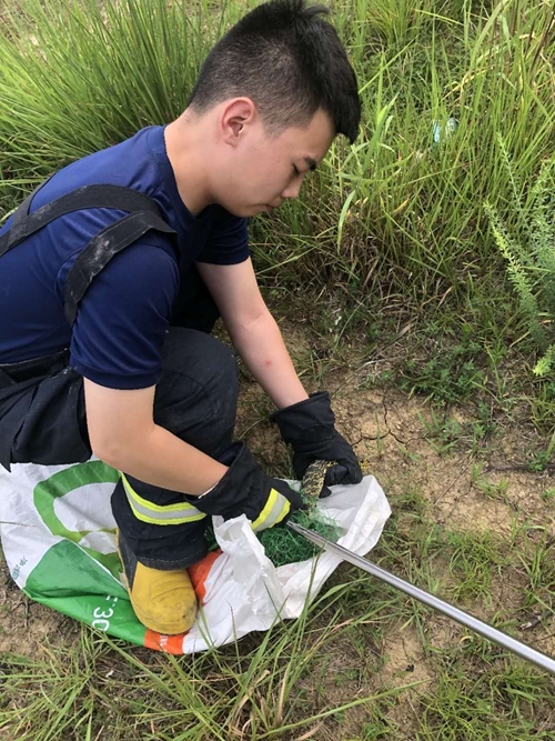 消防员到达现场后发现,大蛇大概2米长,约小臂粗细。由于蛇被困塑料网中,无法动弹,增加了处置难度。见此情况后,两名队员身着全套防护服,先用捕蛇夹固定蛇头,再用剪刀清理蛇身附近的塑料网,最后利用事先准备好的编织袋将其抓获后带到野外放生。