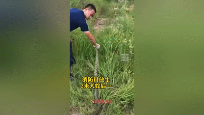 当消防员把大蛇从编织袋中解救出来后,由于蛇太大了,放生后消防员也忍不住大喊“妈妈呀!”然后迅速跑开。