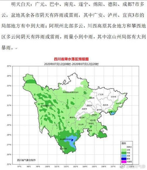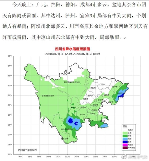 根据四川省气象台今天下午最新分析,预计今天(7月11日)晚上到明天白天,广元、绵阳、德阳、成都4市多云,盆地其余各市阴天有阵雨或雷雨,其中达州、广安、泸州、宜宾、雅安5市局部有中到大雨,个别地方有暴雨;阿坝州北部多云,川西高原其余地方和攀西地区多云间阴天有阵雨或雷雨,雨量小到中雨,其中凉山州部分地方有大到暴雨,个别地方有大暴雨。