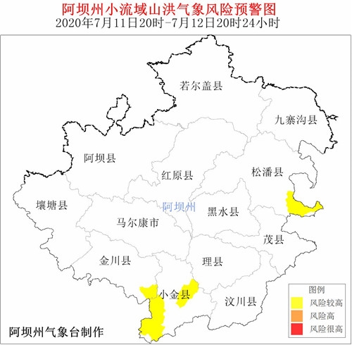 11日20时-12日20时24小时,松潘县、金川县、小金县等3县发生山洪灾害气象风险等级较高。