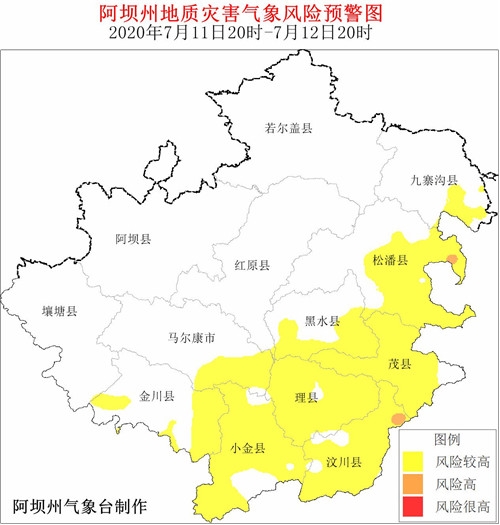 根据气象资料分析,11日20时-12日20时,汶川县、理县、茂县、松潘县、九寨沟县、金川县、小金县、黑水县、马尔康市等9县(市)发生地质灾害气象风险等级较高,其中汶川县、松潘县的部分地方发生地质灾害气象风险等级高,请注意预防。