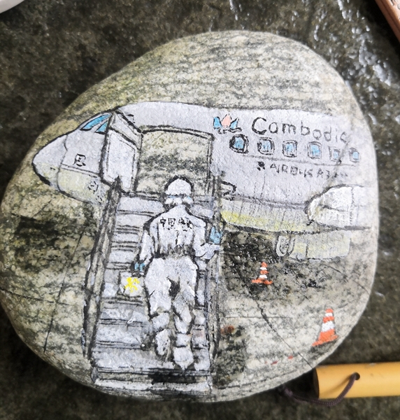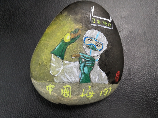 飞机舷梯、防护服、手电筒、拭子……两块坚硬的圆形卵石上,用颜料描绘着感人的抗疫元素。石头画中的“中国海关”字样,让人一眼看出了画面的主角身份。