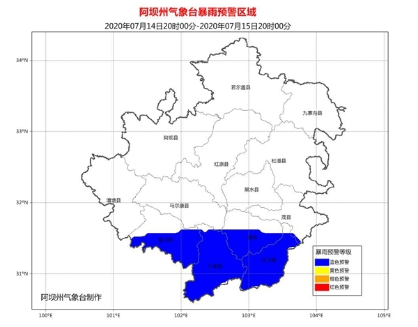 7月14日下午,阿坝州气象台发布暴雨蓝色预警、小流域山洪气象风险预警和地质灾害气象风险预警。