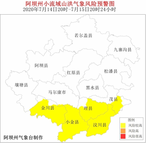 根据气象资料分析,14日20时-15日20时24小时,汶川县、理县、茂县、金川县、小金县等5县发生山洪灾害气象风险等级较高。