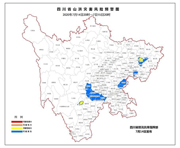 7月14日18时30分,四川省防汛抗旱指挥部发布山洪灾害蓝色预警。