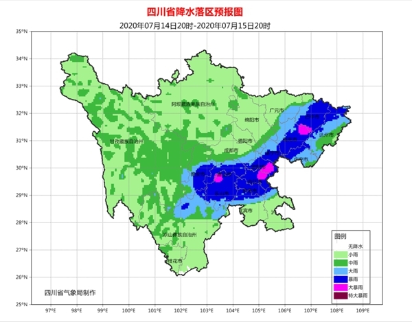 7月14日下午,四川省气象台发布暴雨蓝色预警: