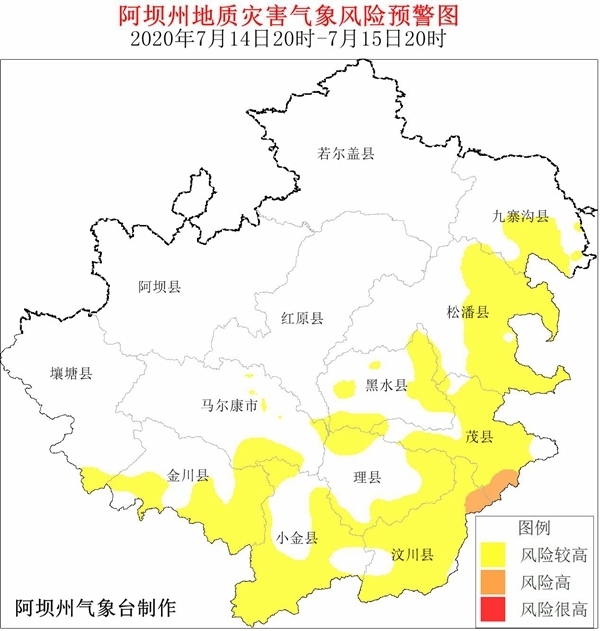 14日20时-15日20时,汶川县、理县、茂县、松潘县、九寨沟县、金川县、小金县、黑水县、壤塘县、红原县、马尔康市等11县(市)发生地质灾害气象风险等级较高,其中汶川县、茂县的部分地方发生地质灾害气象风险等级高,请注意预防。