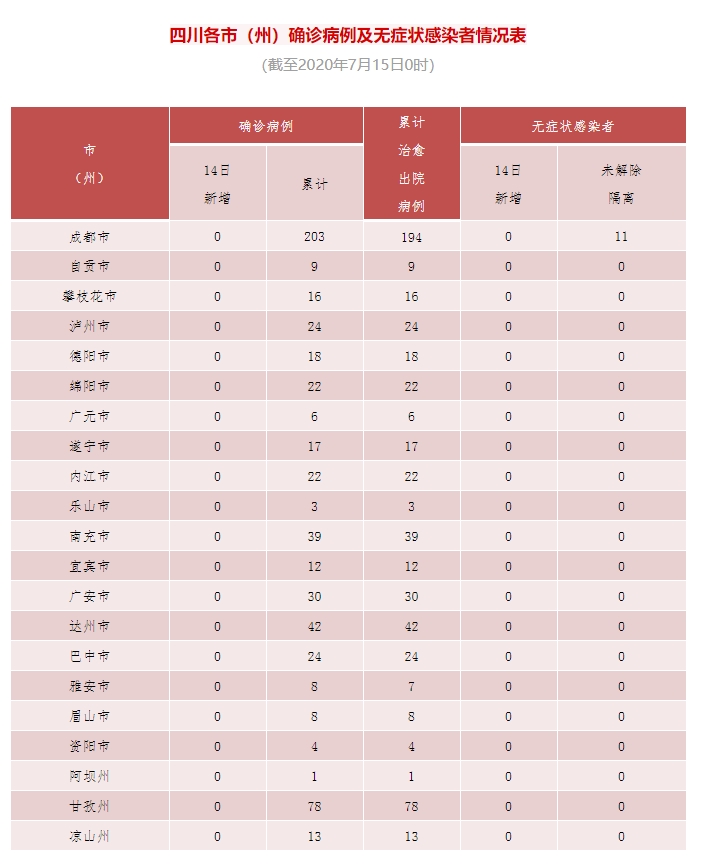 四川在线消息(记者 石小宏)7月15日记者从省卫健委获悉,7月14日0-24时,四川无新增新型冠状病毒肺炎确诊病例,无新增治愈出院病例,无新增疑似病例,无新增死亡病例。