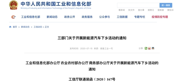 7月15日,记者从工业和信息化部官网获悉,工业和信息化部办公厅、农业农村部办公厅、商务部办公厅联合发布《关于开展新能源汽车下乡活动的通知》(以下简称《通知》)。
