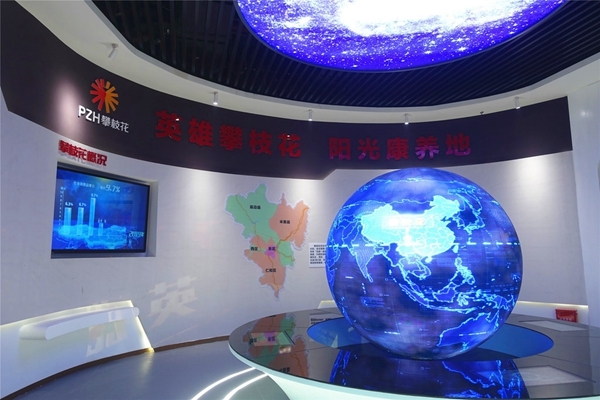 右转进入主展区,蓝色的数字LED球精准定位攀枝花的世界地理位置,触摸下方屏幕,还能清楚展现攀枝花与一带一路及成渝经济圈的关系。穿过“英雄攀枝花 阳光康养地”雾幕,进入时光隧道,就能了解攀枝花的“前世今生”。据介绍,主展区分为“攀枝花在哪里”“攀枝花从哪里来”“攀枝花的现在”“攀枝花的未来” “攀枝花的重点项目及各区县风光”5个展厅,多维度展示攀枝花城市形象、城市文化。