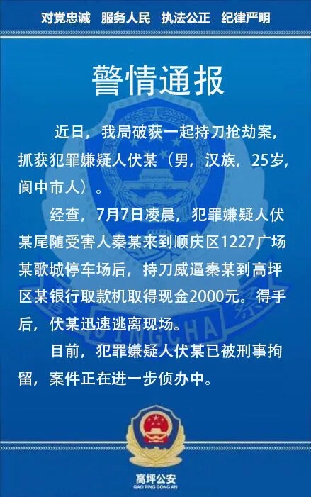 经查,7月7日凌晨,犯罪嫌疑人伏某尾随受害人秦某来到顺庆区1227广场某歌城停车场后,持刀威逼秦某到高坪区某银行取款机取得现金2000元。得手后,伏某迅速逃离现场。