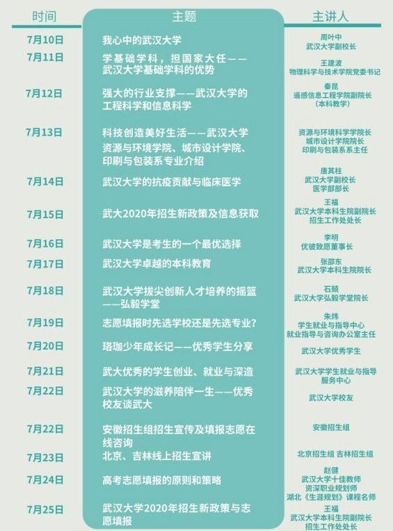 据了解,直播宣讲于7月10日至25日进行,共分为17期,围绕学习、就业、创业、深造等方面,给你留下关于武汉大学的初印象,提供志愿填报的权威指导。