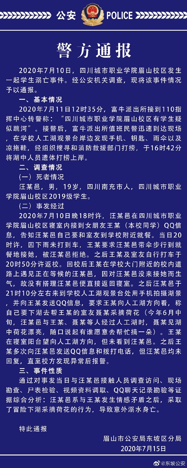 7月10日,四川城市职业学院眉山校区发生一起学生溺亡事故,7月15日,东坡警方通报相关情况。