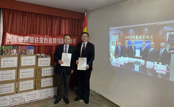 目前,巴西新冠肺炎疫情形势严峻,国际抗疫合作的重要性日益凸显。 当晚还举行了四川省捐赠中国驻里约热内卢总领馆抗疫物资交接仪式。据悉,四川省侨办与省中医药管理局近期组织协调了1000盒四川省研发的“新冠0号”“新冠1号”中药颗粒剂和300本抗疫书籍,作为抗疫物资捐赠给中国驻里约热内卢总领馆。