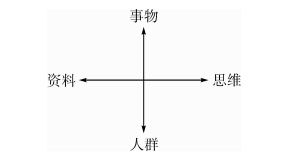 我们可以把兴趣分成两个维度、四个方向,就像一个直角坐标系上的四个象限。纵向坐标的两端分别是事物和人群,横向坐标的两端分别是资料和思维。