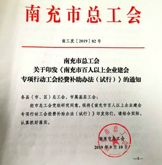 ——抓好正向激励,落实经费保障。将建会建家建制工作作为一项打基础、利长远的民生工程,常抓在手、常抓常新,既注重打持久战、又注重打狙击战。南充市总工会出台了《南充市非公企业兼职工会主席履职津贴实施办法(试行)》和《南充市25人以上企业建会专项行动经费补助办法》,对符合发放条件的非公企业兼职工会主席给予不超过500元每月履职津贴,对新建会企业既按会员人数给予每人100元的会费补助。