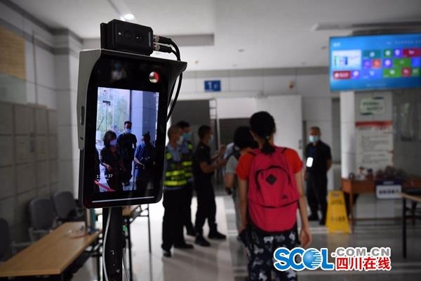 阅卷组所在大楼门口,往年阅卷点常设的“安检门”前,新添一道测温关,安装多个测温机器,可实现不戴口罩便成功进行人脸识别。