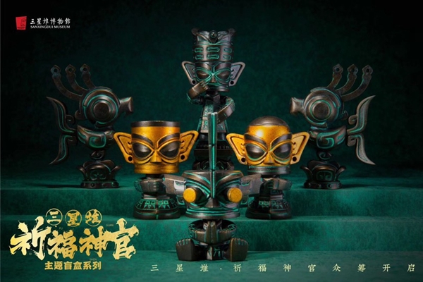 “三星堆遗址所出土的大量玉石器和青铜器,基本上都是用于祭祀的礼器,带有浓郁神巫和神权色彩的信仰体系正是三星堆文化的内核与精髓所在。基于此,我们逐步在脑海中萌生了要做一套三星堆祈福神官盲盒产品的想法。”三星堆博物馆市场营销部部长林维说,“我们选取了5个极具代表性的文物形象,分别配以人设,强调其天人合一、人神互通的灵气,打造出一个青铜时代的‘偶像天团’。”
