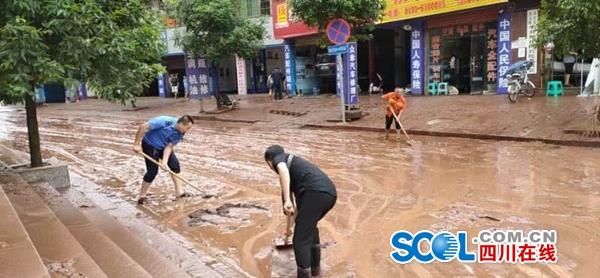 17日18时,九支镇突然出了太阳,附近河流的水也早早消退,愁容满面的刘彬在短暂的松了一口气后,接着和上百名村(社区)干部到九支镇安居坝社区及附近,帮助附近的街道、商户、停车场,清理半个手臂般厚的淤泥。