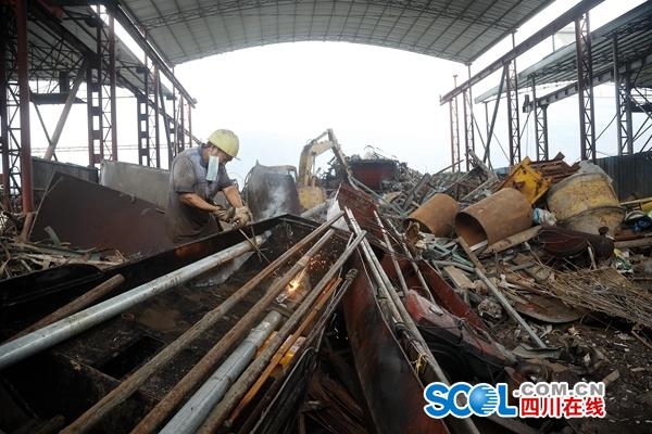 在废品收购站,工作人员进行切割,淡蓝色的火焰与船体接触冒出橘红色的火星,船体上慢慢出现了一条贯穿船体的豁口……