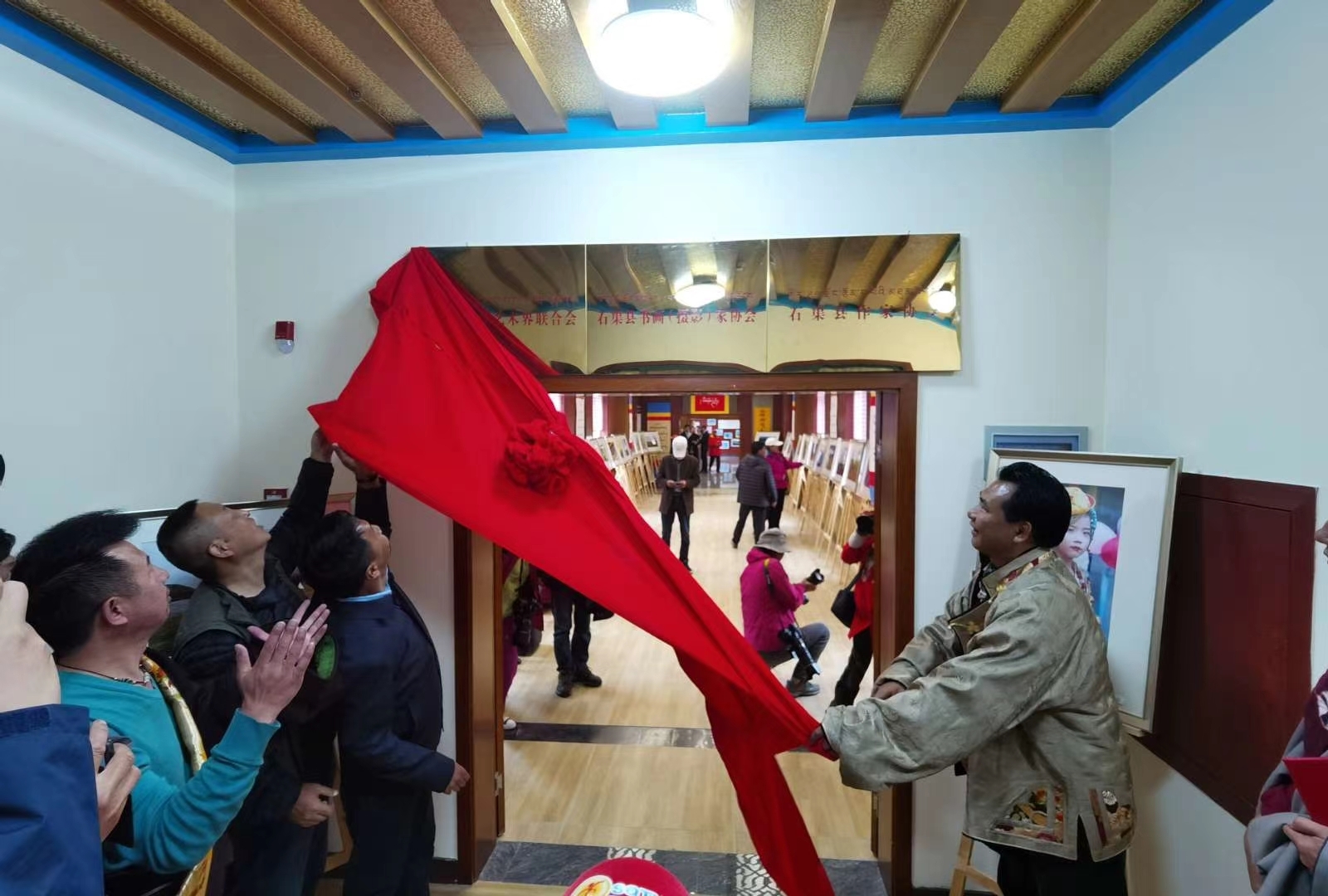 石渠县文学艺术界联合会办公场地内设作品展出长廊、藏汉文书法工作室等。成立仪式现场,由石渠县文学艺术界联合会成员创作的150余幅摄影、藏汉文书法、文学创作精品及其获奖作品,分门别类在长廊、藏汉文书法工作室墙上展出,其中30余幅获省州级奖项。(图片由石渠县委宣传部提供)
