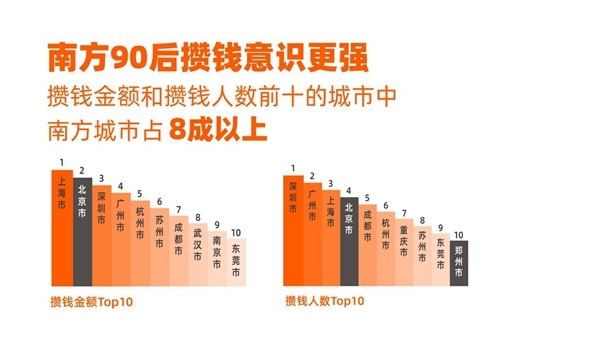 南方人精打细算的性格也反映到了攒钱上。报告显示,90后攒钱金额和攒钱人数前十的城市中,南方城市占8成以上。其中,成都90后攒钱人数在全国排名第五,攒钱金额全国排第七。