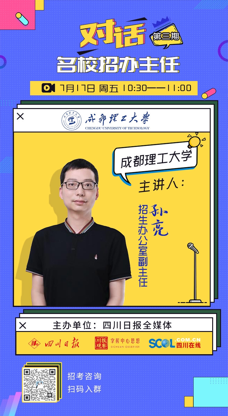 四川在线消息(记者 李丹)7月16日,由四川日报全媒体集群重磅推出的“后浪们,高校招办主任‘拍了拍’你”2020高校招生咨询直播第二场开启。成都理工大学招生办副主任孙亮作为嘉宾做客直播间,为考生和家长解读成都理工大学今年招生政策,解答网友问题。