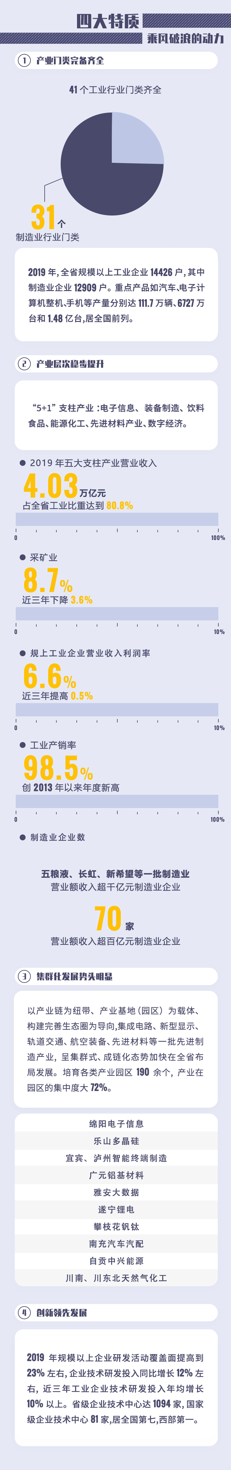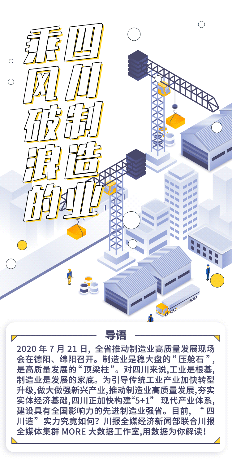 2020年7月21日,全省推动制造业高质量发展现场会在德阳、绵阳召开。 制造业是稳大盘的“压舱石”,是高质量发展的“顶梁柱”。对四川来说,工业是根基,制造业是发展的家底。为引导传统工业产业加快转型升级,做大做强新兴产业,推动制造业高质量发展,夯实实体经济基础,四川正加快构建“5+1”现代产业体系,建设具有全国影响力的先进制造业强省。目前,“四川造”实力究竟如何?川报全媒经济新闻部联合川报全媒体集群MORE大数据工作室,用数据为你解读!
