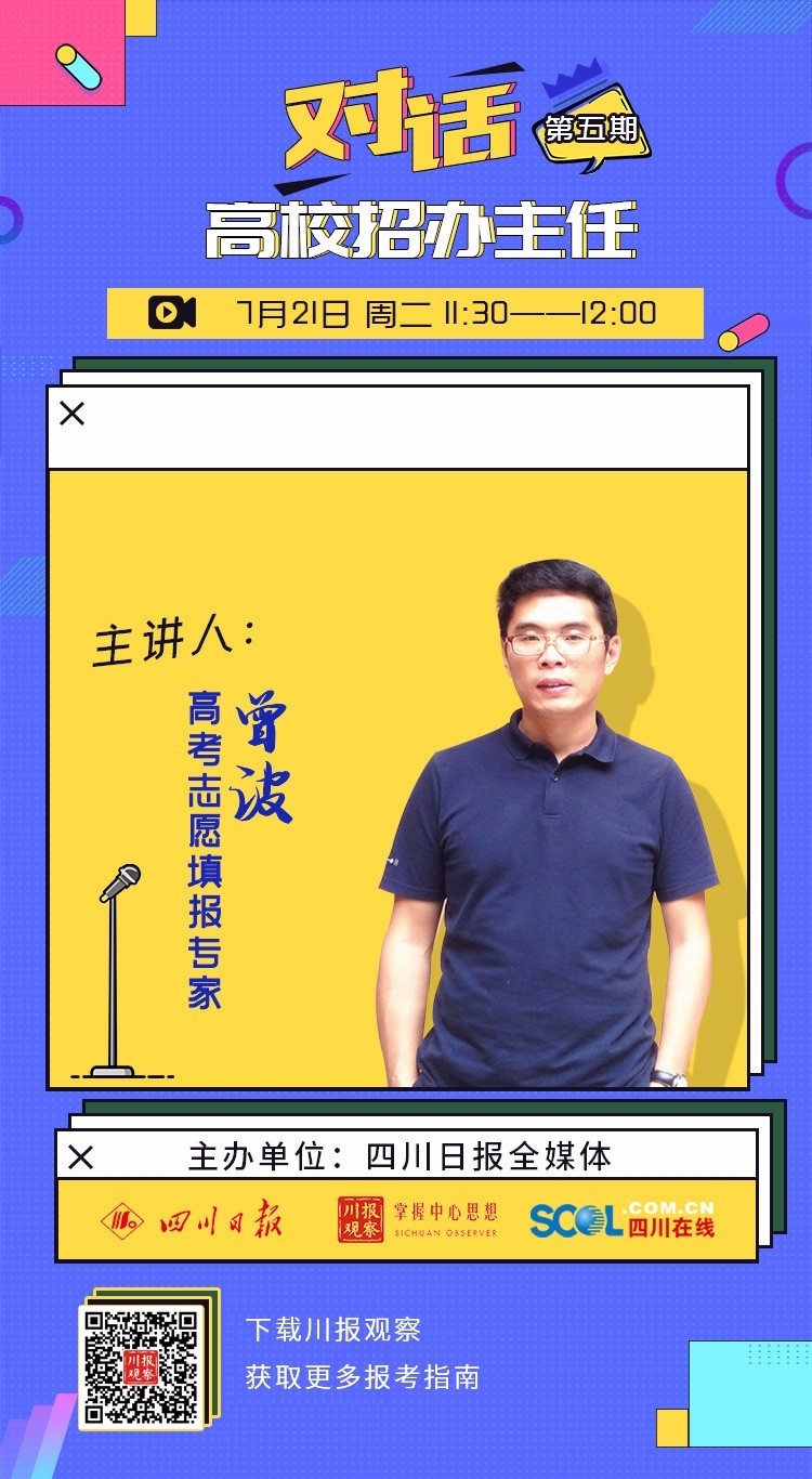 四川在线消息(刘梦 记者 李丹)7月21日,由四川日报全媒体集群重磅推出的“后浪们,高校招办主任‘拍了拍’你”2020高校招生咨询直播第五场开启。高考志愿填报专家曾波作为嘉宾做客直播间,为考生和家长解读高考志愿填报相关问题。