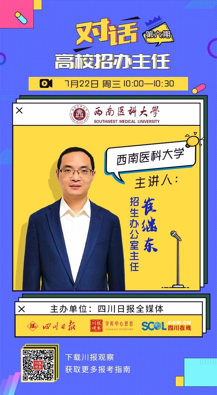 四川在线消息(记者 张庭铭)7月22日,由四川日报全媒体集群重磅推出的“后浪们,高校招办主任‘拍了拍’你”2020高校招生咨询直播第六场开启。西南医科大学招生办公室主任崔继东作为嘉宾做客直播间,为考生和家长解读西南医科大学今年招生政策,解答网友问题。