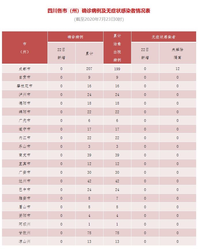 四川在线消息(记者 石小宏)7月23日记者从省卫健委获悉,7月22日0-24时,四川无新增新型冠状病毒肺炎确诊病例,新增治愈出院病例1例,无新增疑似病例,无新增死亡病例。