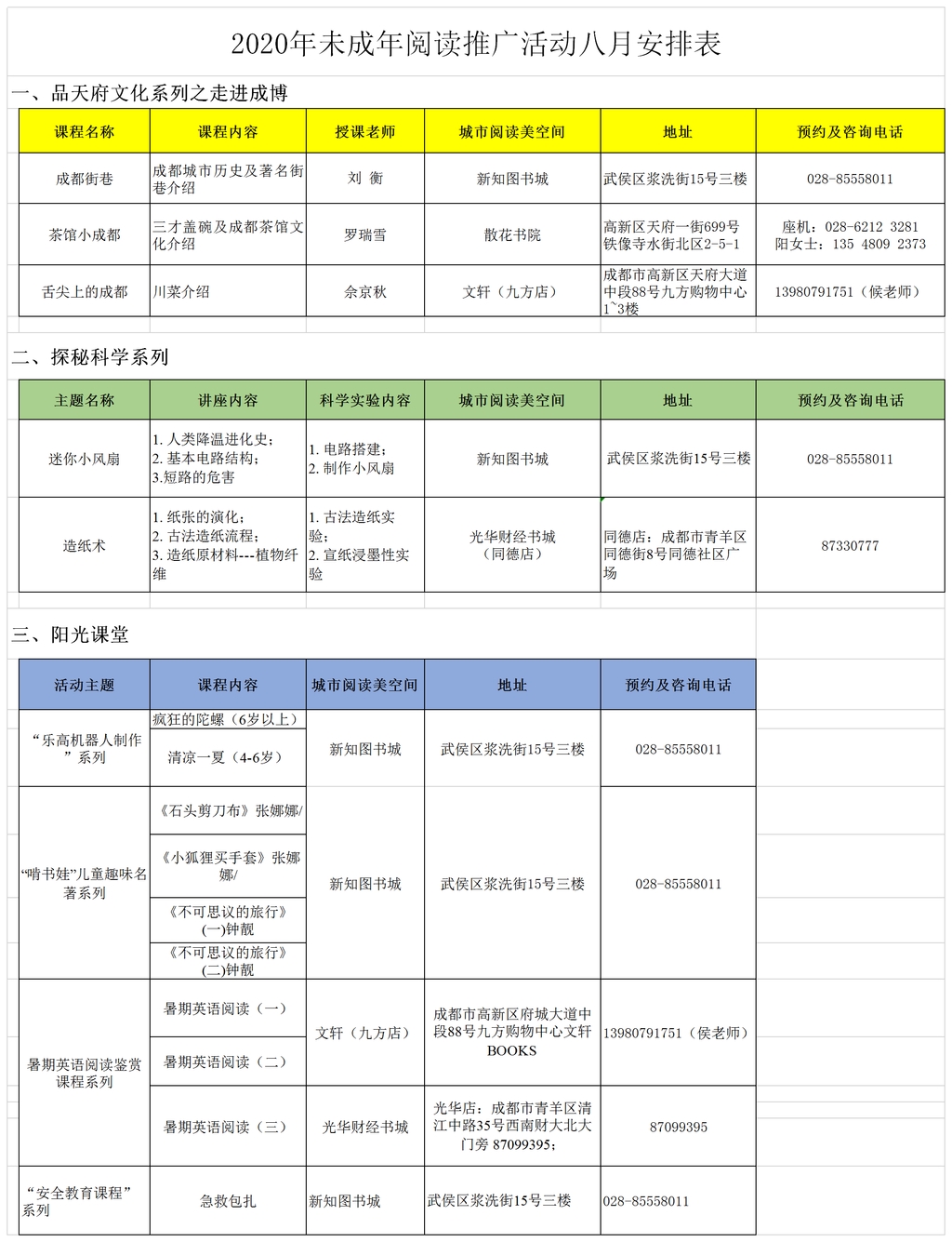 此外,还有《舌尖上的成都》、《暑期英语阅读》、“儿童趣味名著”等课程将陆续在各城市阅读美空间上线。需要注意的是,为保证读者健康安全,每场线下讲座均对人数进行了控制,想要报名的读者朋友可通过“成都图书馆”微信公众号预约,或通过城市阅读美空间的咨询电话,提前报名参加。