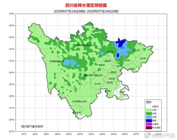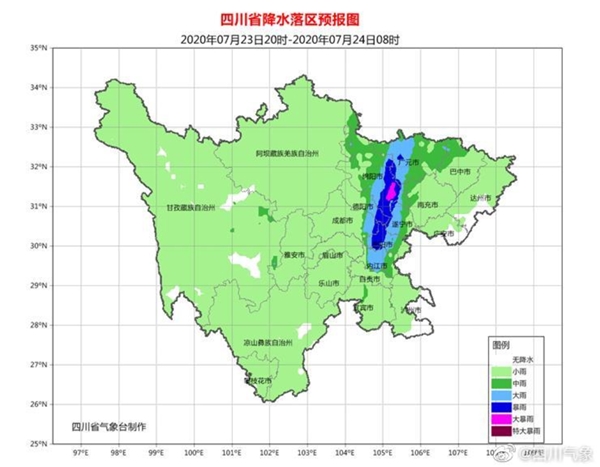 四川省气象台7月23日15时30分发布暴雨蓝色预警:今天晚上到明天白天,广元、绵阳2市和南充、遂宁、资阳3市的西部及德阳市东部有大雨到暴雨(雨量40~70毫米),其中广元、绵阳2市的局部地方有大暴雨(雨量140~180毫米);甘孜州中东部的部分地方有大雨。