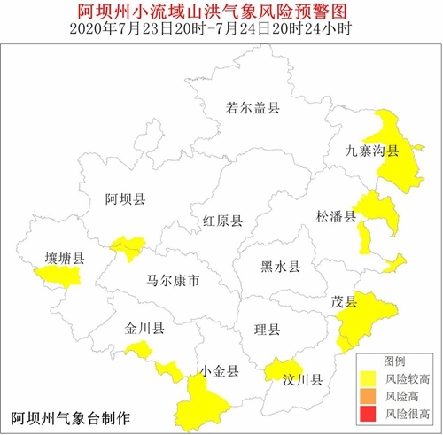 23日20时-24日20时24小时,汶川县、理县、茂县、松潘县、九寨沟县、金川县、小金县、壤塘县、阿坝县、马尔康市等10县(市)发生山洪灾害气象风险等级较高。