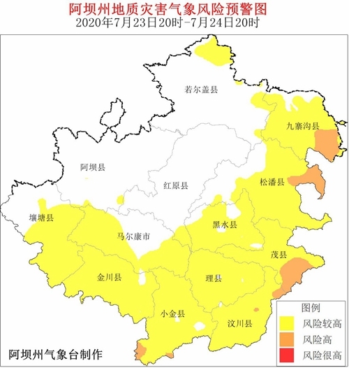 根据气象资料分析,23日20时-24日20时,阿坝州发生地质灾害气象风险等级较高,其中汶川县、茂县、松潘县、九寨沟县、小金县的部分地方发生地质灾害气象风险等级高,请注意预防。