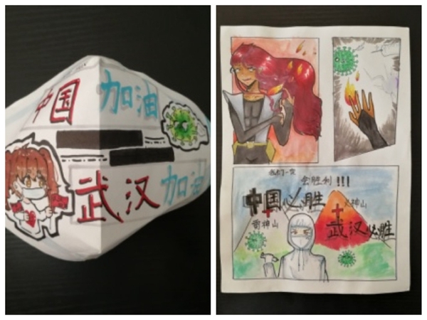 金沙小学六年级10班的刘家萱,更是宅家神兽中的“手工达人”。2月18日原本是学校开学的日子,已经在家20天没出门的刘家萱说,“宅家,是我参与战斗的坚决姿态!” 她听妈妈说,现在口罩紧缺,家里已经没有太多口罩,外面药店都贴着“口罩售完”的字样。于是,喜欢DIY的刘家萱用纸、剪刀、胶水和画笔自己做了口罩,并画了一幅写着“武汉必胜,中国必胜”的漫画。“希望能用它们给抗疫一线的叔叔阿姨们加油。”