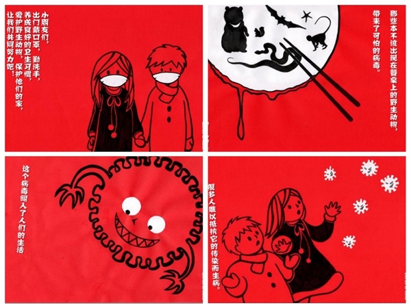 除了给医务人员送上祝福,展览上还有暖心的小朋友防疫科普。“为什么第一天晚上刚到爷爷奶奶家,第二天就要赶回成都?为什么不能出门玩?为什么所有的假期计划都取消了?为什么只能在网络视频中才能见到老师和小伙伴们?是不是我们生活的世界被按了暂停键?” 对于疫情带来的种种改变,7岁的小朋友钟虓玥有许多问号。11岁的哥哥姚虓旸从新闻中知道新冠肺炎,将这些信息转化成妹妹能够理解的方式告诉她。兄妹俩用了两天时间构思,一起分工合作,用剪纸、粘贴、手绘和电脑制作,最终完成了这幅四格科普漫画。