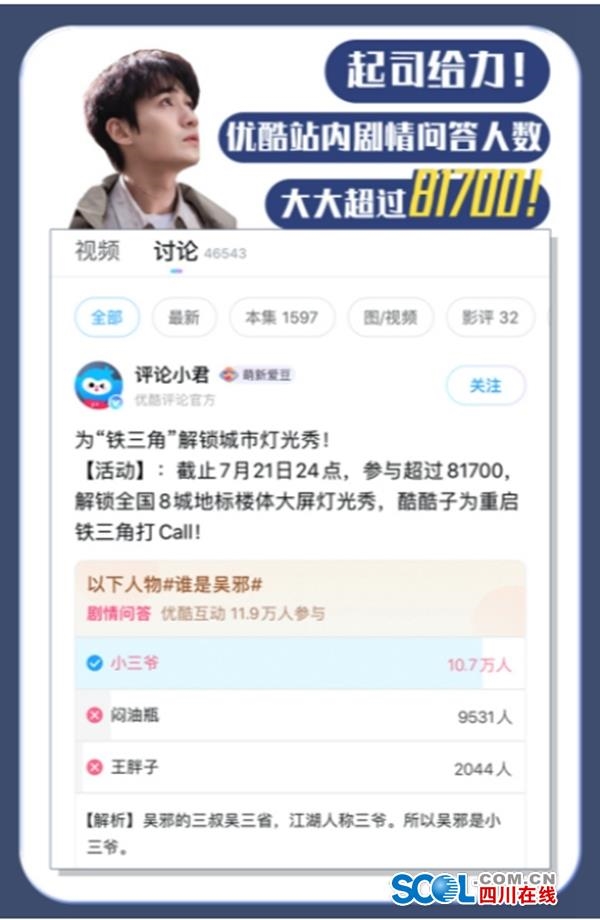 据悉,“《重启》8城灯光秀应援”的创意灵感就源自网友。该剧上线后,优酷密切关注用户的反馈,第4集“铁三角”名场景播出后,网友纷纷提议用“谁是吴邪”做话题应援。优酷随即在站内发起对赌活动,在约定时间内完成目标,即可解锁8城地标建筑大屏的超豪华应援。据优酷数据显示,活动实际参与人数近12万,是原定人数的1.5倍。“排面来了,这波应援给优酷满分!”网友纷纷通过微博点赞。