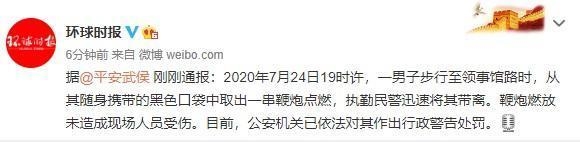 据@平安武侯刚刚通报:2020年7月24日19时许,一男子步行至领事馆路时,从其随身携带的黑色口袋中取出一串鞭炮点燃,执勤民警迅速将其带离。鞭炮燃放未造成现场人员受伤。目前,公安机关已依法对其作出行政警告处罚。