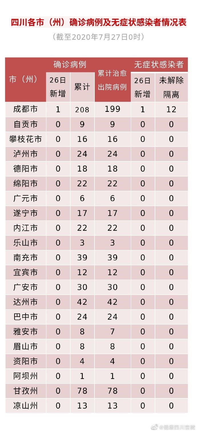 四川在线消息(记者 石小宏)7月27日记者从省卫健委获悉,7月26日0-24时,四川新增新型冠状病毒肺炎确诊病例1例(境外输入,7月24日乘飞机从埃及出发,7月25日抵达成都后即接受隔离医学观察和动态诊疗,7月26日确诊),无新增治愈出院病例,无新增疑似病例,无新增死亡病例。