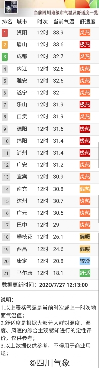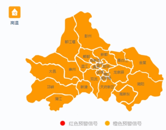 此前,眉山市彭山区、仁寿县、东坡区,乐山市井研县、犍为县,德阳什邡市,雅安市雨城区,成都市温江区、新津县、大邑县、邛崃市、简阳市、崇州市、新都区,广元市旺苍县、苍溪县,绵阳江油市已率先发布高温橙色预警信号。
